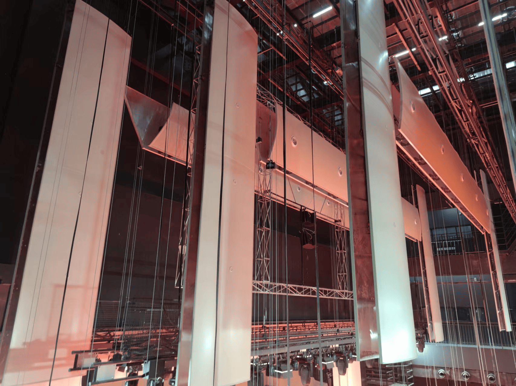 全悬挂自动收放式舞台反声罩是舞台反声罩的一种全新类型,是将舞台反声罩的所有反射板,包括后板,顶板和侧板全部悬挂在舞台机械的吊杆上,使得反声罩可以快速放下展开搭建或者向上折叠收起,其中对反声罩的升降操作进行了自动化编程,使得收放均为一键式操作,时间分别为2分半钟,做到自然声演出和电扩声演出节目之间的快速换场。